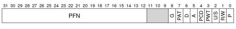 x86 아키텍처의 PTE(페이지 테이블 엔트리) 구조는 낮은 비트 순으로 설명하자면, 먼저 위에서 설명한 present 비트(P)가 있고, 읽기 전용인지 쓰기가 가능한지 구분하는 R/W 비트, 유저 모드에서도 페이지 접근이 가능한지 또는 관리자 모드에서만 접근이 가능한지 결정하는 U/S 비트가 있다. PWT, PCD, PAT, G 비트 등은 어떻게 하드웨어 캐싱을 하는지를 결정한다. A와 D는 각각 둘 다 위에서 이미 설명한 Accessed, Dirty 비트다. 마지막으로, 페이지 프레임 번호(PFN)가 있다.